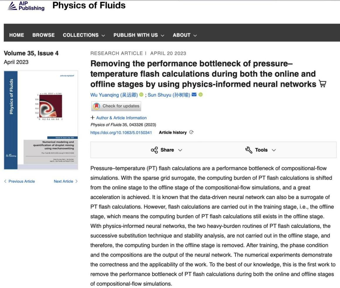 近日,吴远卿特聘副教授在流体力学领域权威期刊Physics of Fluids 上发表题目为Removing the performance bottleneck of pressure–temperature flash calculations during both the online and offline stages by using physics-informed neural networks的研究论文(DOI: https://doi.org/10.1063/5.0150341)。sunbet申搏为本文第一完成单位,阿卜杜拉国王科技大学的孙树瑜教授为本文通讯作者。