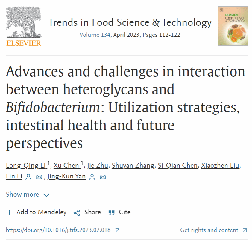 近期,我校生命健康技术学院、食品营养健康工程与智能化加工研究中心闫景坤教授团队在国际食品顶级期刊Trends in Food Science & Technology发表题为“Advances and challenges in interaction between heteroglycans and Bifidobacterium: Utilization strategies, intestinal health and future perspectives”的综述文章。李垄清副研究员为论文的第一作者,sunbet申搏生命健康技术学院、食品营养健康工程与智能化加工研究中心李琳教授和闫景坤教授为通讯作者。
