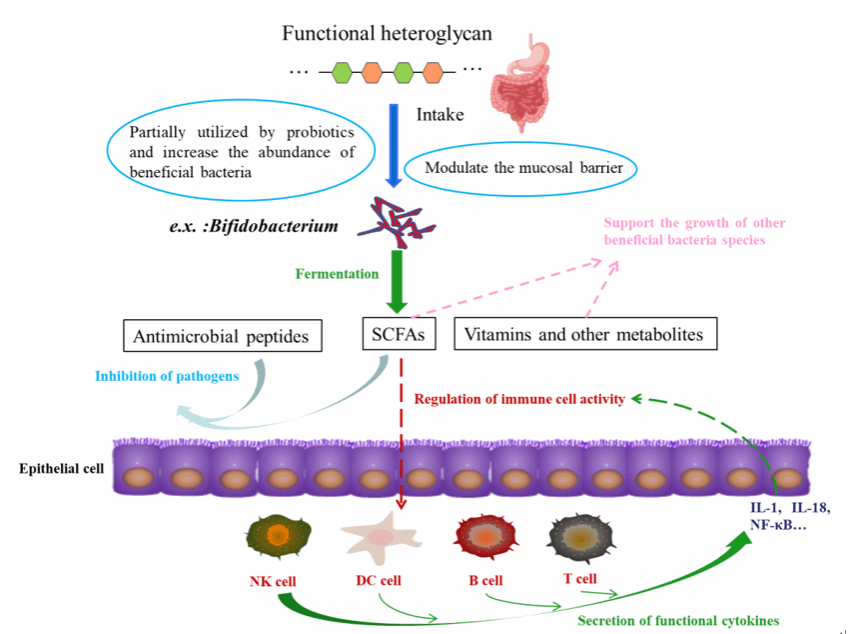 摄入杂多糖能促进双歧杆菌定植,重塑人体肠道菌群。杂多糖不能被人类基因组中编码的酶完全降解,大多数的杂多糖到达大肠中被肠道微生物降解。双歧杆菌属是在人类胃肠道中关键肠道微生物之一,能代谢各种结构复杂的多糖,包括:阿拉伯木聚糖、魔芋葡甘聚糖、n-聚糖、果胶、O-GalNAc聚糖等杂多糖,能够生成短链脂肪酸(SCFAs)、乳酸等代谢产物,有助于双歧杆菌属的定植、调节肠道菌群、增强人体免疫力、减少过敏反应等。然而,双歧杆菌对杂多糖的代谢途径、肠道菌群调节机制和人体健康调节作用尚未明确。