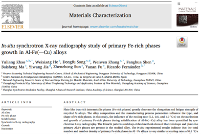 近日,我校中子散射工程研究技术中心团队在材料领域的TOP期刊Materials Characterization发表了最新的研究成果“In-situ synchrotron X-ray radiography study of primary Fe-rich phases growth in Al-Fe(-Cu) alloys”。团队特聘副研究员赵愈亮为论文第一作者、华南理工大学张卫文教授和西班牙国家冶金研究中心Ricardo Fernández为共同通讯作者。