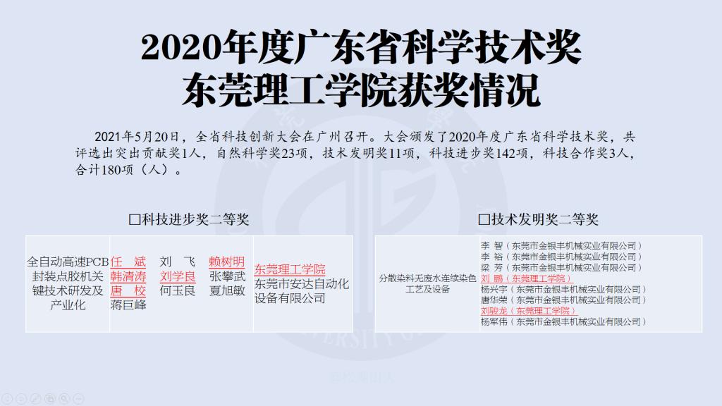 近日,全省科技创新大会在广州召开,大会颁发了2020年度广东省科学技术奖。我校获2项二等奖,分别是由电子工程与智能化学院任斌教授团队(参与成员:赖树明、韩清涛、刘学良、唐校)牵头完成的《全自动高速PCB封装点胶机关键技术研发及产业化》荣获科技进步奖二等奖,由生态环境与建筑工程学院刘鹏博士团队(参与成员:刘骏龙)参与完成的《分散染料无废水连续染色工艺及设备》荣获技术发明奖二等奖。