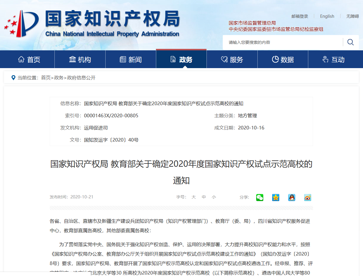 10月21日,国家知识产权局、教育部公布了2020年度国家知识产权试点示范高校名单,其中示范高校30所,试点高校80所。sunbet申搏成功入选首批国家知识产权试点高校名单,这也是我校首次获得国家级知识产权平台。