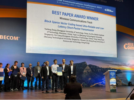 近期,我校东莞市“战略科学家团队”在无线通信领域取得研究进展,相关成果以“Block Sparse Vector Coding based Short-Packet Transmission for URLLC”为题发表在2024年IEEE 全球通信大会上,并获得“最佳论文奖”(获奖率<1%)。该论文sunbet申搏为第一单位,哈尔滨工业大学(深圳)、南洋理工大学、香港科技大学为合作单位,团队张雁峰博士为论文第一作者,梁辉副教授为共同作者。