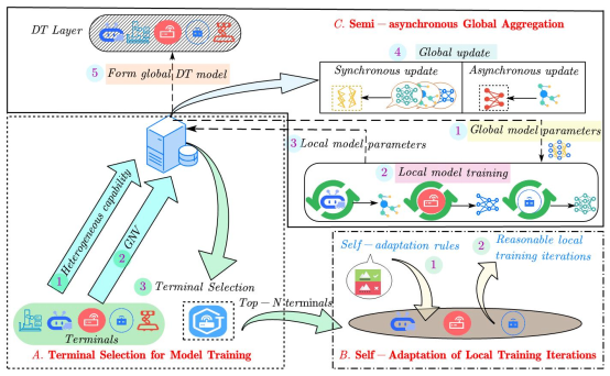 在边缘智能范式下,依托数字孪生(DT)的虚实协同优势,数字孪生边缘网络(DITEN)已广泛应用于工业物联网(IIoT)场景支持等效模型训练,从而在不干扰实际生产运行的前提下,实现经济高效的执行。本文聚焦IIoT中数字孪生构建/更新问题。在DT模型训练过程中,由于对工业终端异构的计算与通信能力考量不足,导致DT模型在全生命周期内面临训练成本与损失失衡的问题,这既制约了对复杂动态生产场景的快速响应能力,也难以保障虚实空间的数据一致性。为此,定义了带约束的全局损失最小化问题,并提出了一种基于半异步联邦学习的解决方案:EDT-SaFL。通过综合考虑异构资源的协同利用,以及本地数据数量和质量对全局模型更新的贡献,该方案主要设计了三个核心操作:面向模型训练的终端选择机制、本地训练迭代的自适应策略,以及半异步全局聚合方法。进一步地,团队分析了算法收敛性、复杂性和通信开销。相关研究成果可广泛应用于工业物联网等复杂动态场景,为智能工业系统的高效运行提供技术支撑。